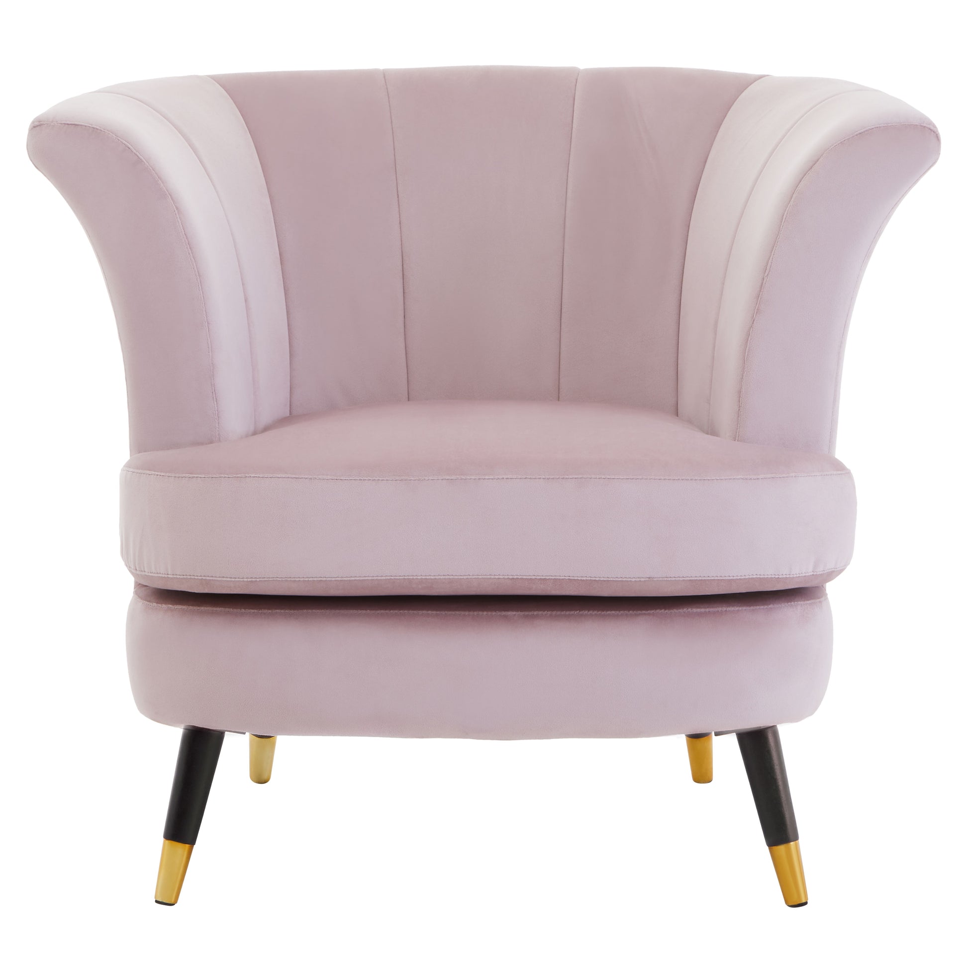 The Aria Scalloped Armchair exhibits a timeless nod to the art deco era. Upholstered in sleek mink velvet with sturdy wood legs and a gold accent, this piece will be the envy of all that see it. A perfect blend of luxe, comfort and style.