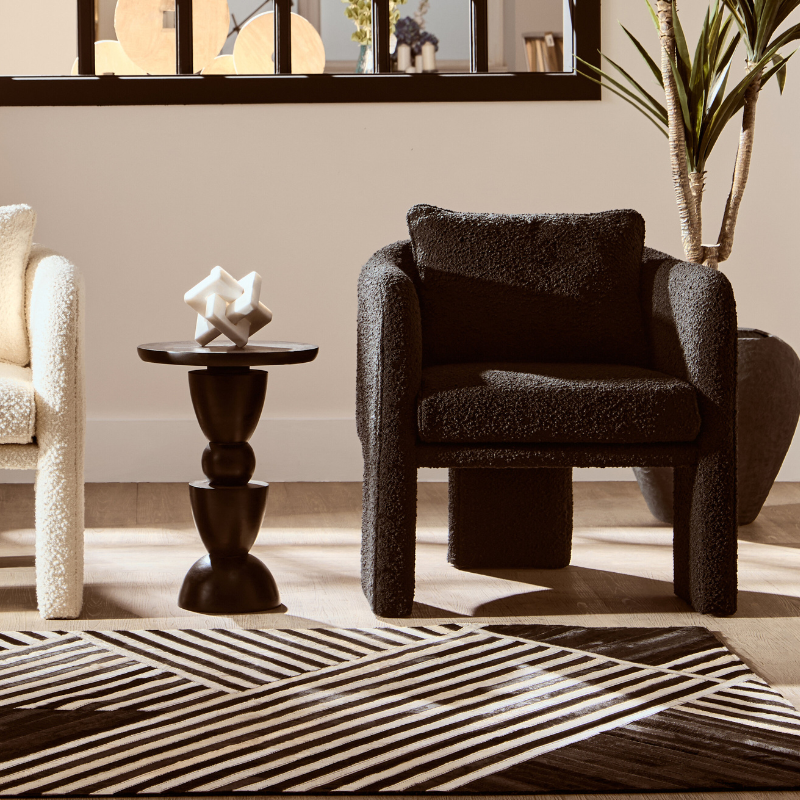 The Ayden armchair in black bouclé is a bold, sculptural piece designed to bring contemporary edge and comfort to your interior. Wrapped in a rich, tactile bouclé fabric, its curved frame and deep seat create a cocooning effect, perfect for relaxing in style. The tonal black finish and clean-lined silhouette make it a versatile choice for modern, minimalist or statement spaces.