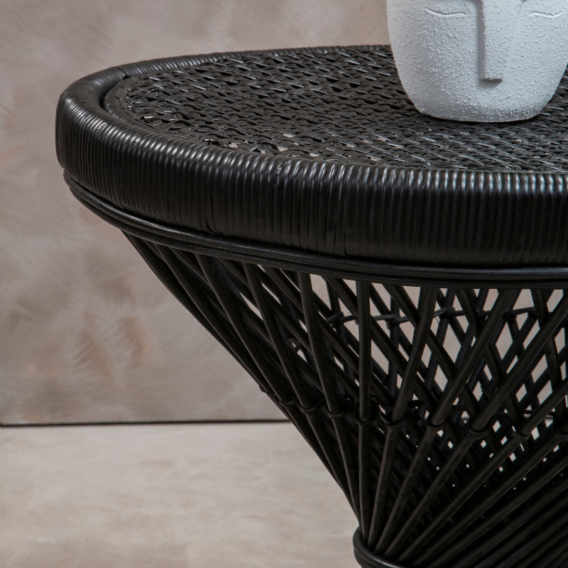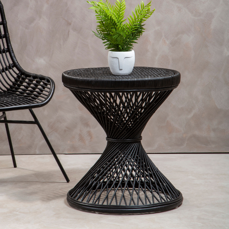 Sculptural, airy, and effortlessly bold — the Calla Black Twisted Table by Sage & Wyld is a design-forward accent that brings organic movement and modern texture into your home. Its distinctive hourglass silhouette, formed from intricately wrapped natural rattan, creates a beautiful interplay of negative space and structural form.