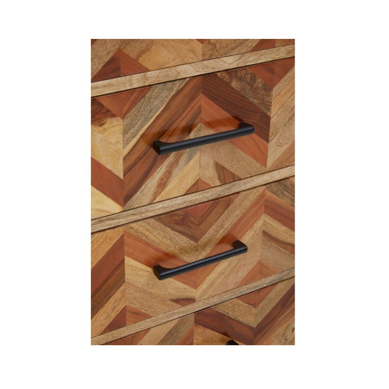 The Clover Five Drawer Chest is crafted from various hues of natural mango wood. Set on top of matte black iron legs, the natural material combined with the metal feet create industrial look with a soft edge.