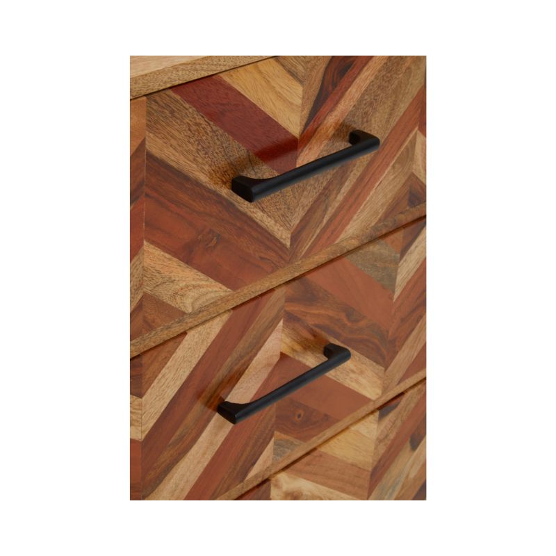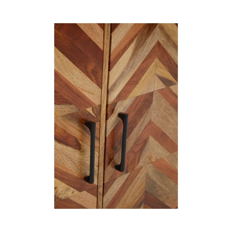 The Clover Storage Sideboard is crafted from various hues of natural mango wood. Set on top of matte black iron legs, the natural material combined with the metal feet and handles create industrial look with a soft edge. This piece boasts ample storage space with two doors concealing four generous shelves along with three, separate drawers.