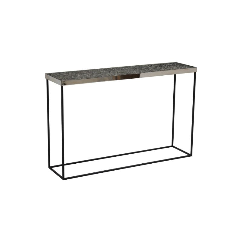 The Dakar Silver Console Table boasts study and slender legs that meet a rectangular base that mirror the shape of the table top. This piece with it’s textured, metallic surface and matte black frame this is minimal, modern industrial style.