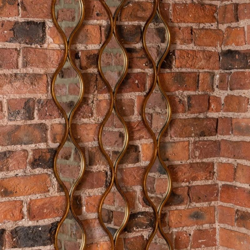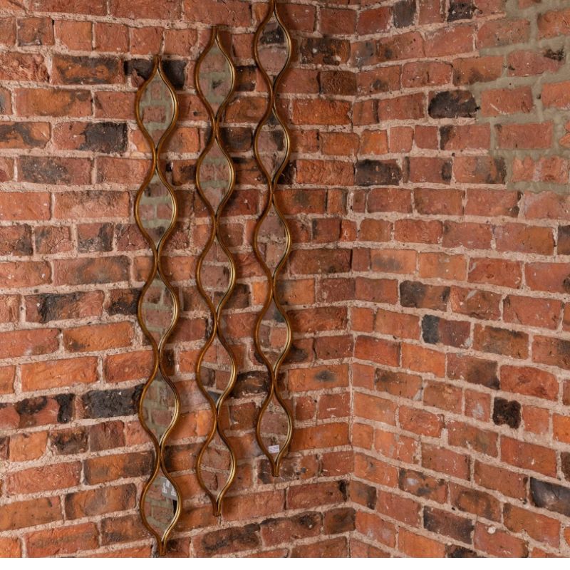 Organic curves and vintage charm define the Deniz Hanging Mirror by Sage & Wyld. This striking vertical wall mirror features an elegant, wave-like silhouette, composed of six teardrop-shaped mirror panels framed in an antique-style gold finish with a timeworn, sculptural texture.