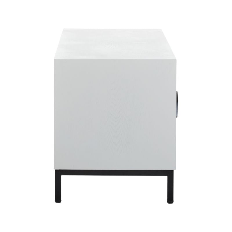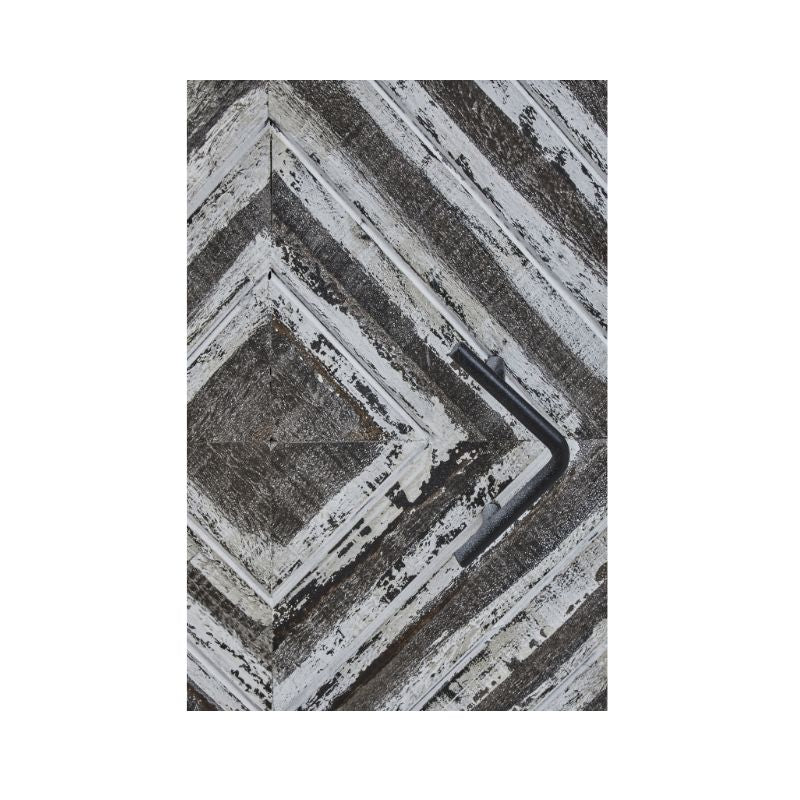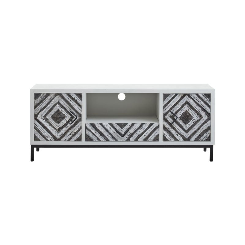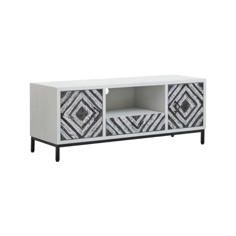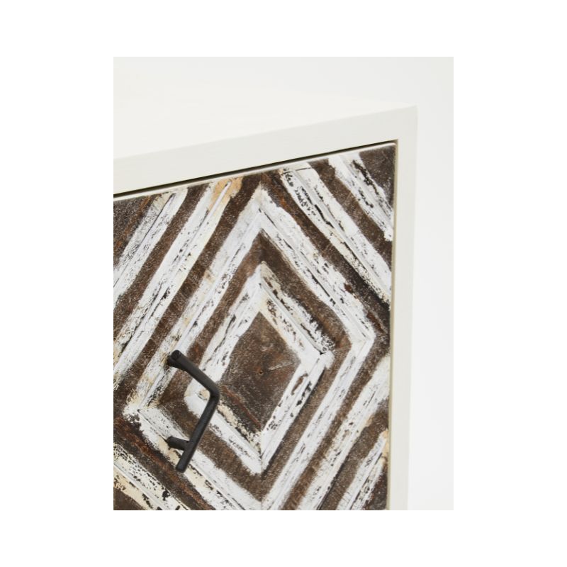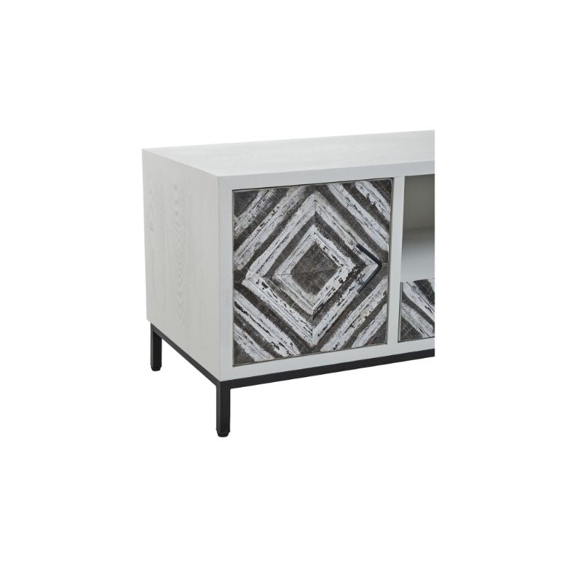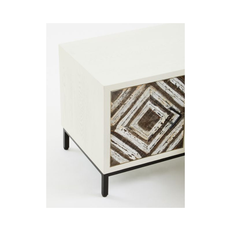 This geo patterned media unit is crafted from natural wood and sits on top of a sleek, black metallic base. The neutral tones of this piece coupled with the slightly distressed finish of the doors make this piece both beautiful and functional. A monochrome look with a nod to boho chic.