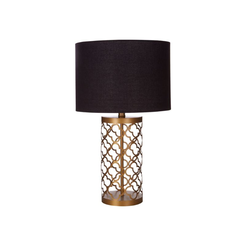 The Elthan Table Lamp features a geometric pattern carved into a cylindrical base. The sleek black shade and copper finish give this lamp the luxe, timeless look.