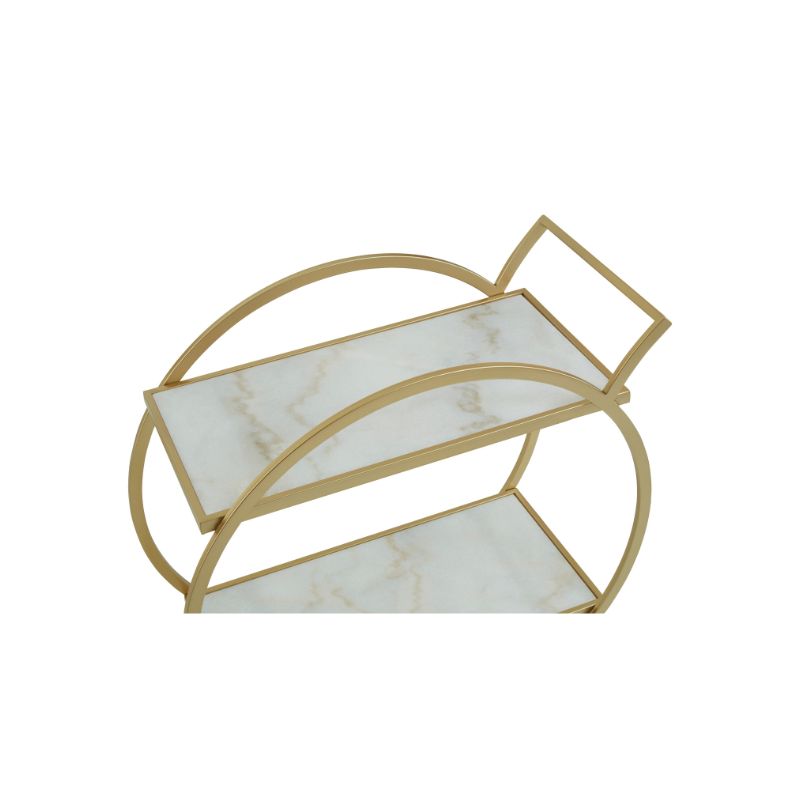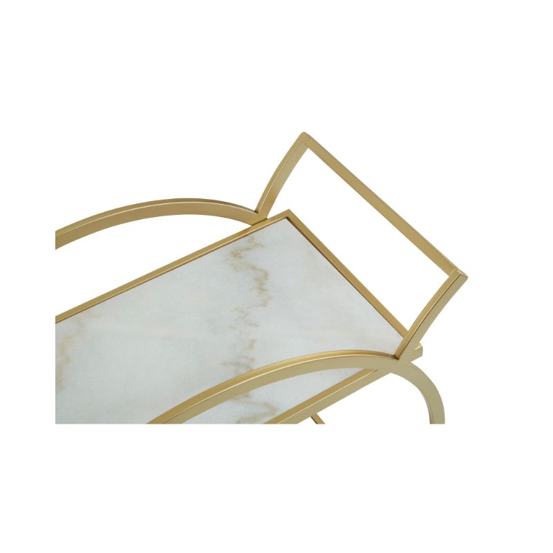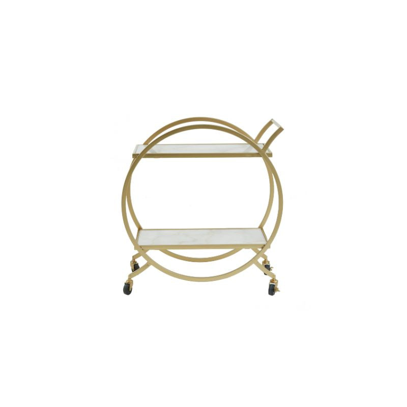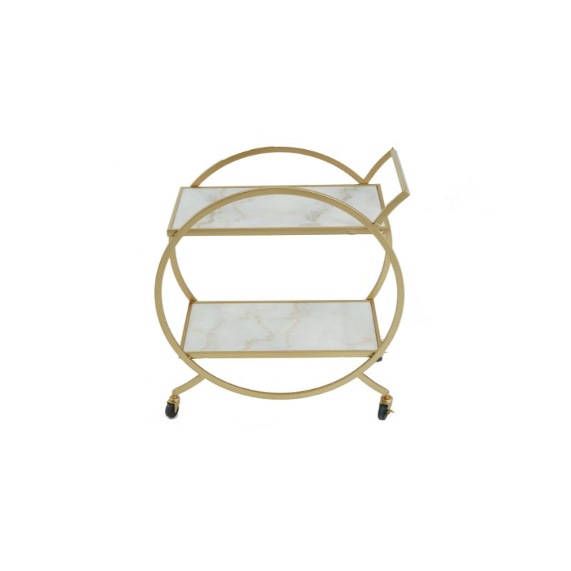 The Kylie Drinks trolley boasts a luxe gold finish and two marble shelves for ample storage. The art-deco inspired design can be seen in the circular frame. Set on top of castor wheels, this trolley can be easily manoeuvred.