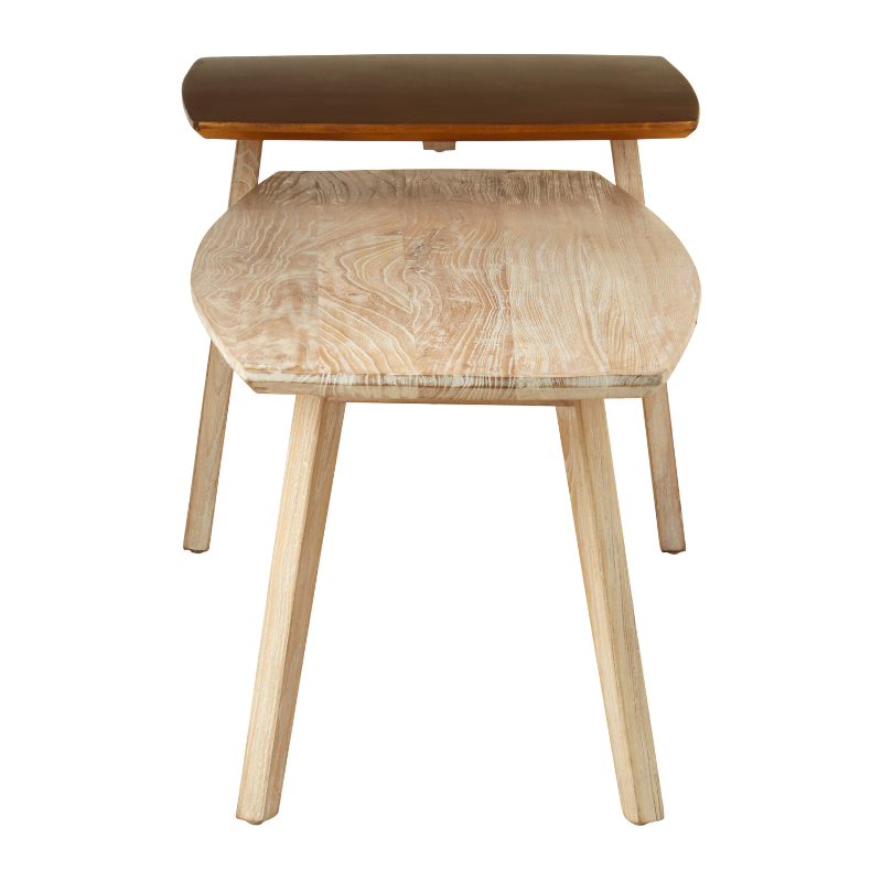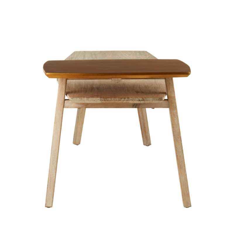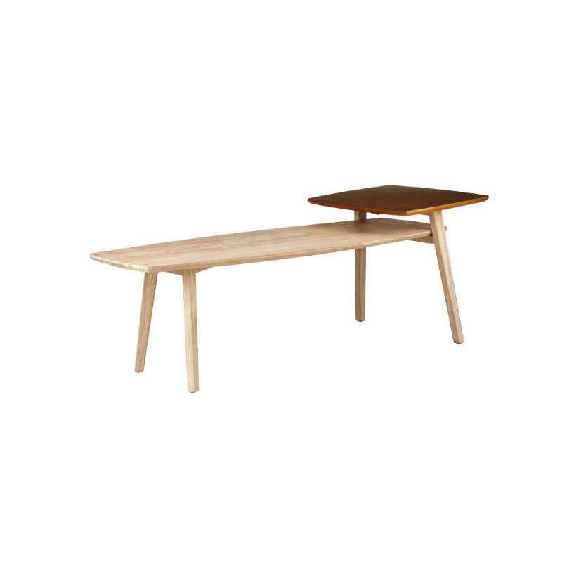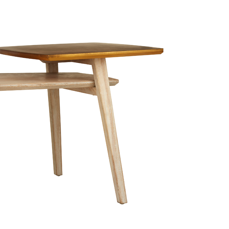 Blending modern function with a touch of artistic flair, the Maddy Coffee Table is a standout piece for contemporary interiors. Its unique two-tier design features a raised square platform finished in a rich gold tone, gracefully contrasting the natural wood grain of the elongated base. Perfect for displaying décor, serving drinks, or simply adding visual interest, this coffee table offers both elegance and practicality.