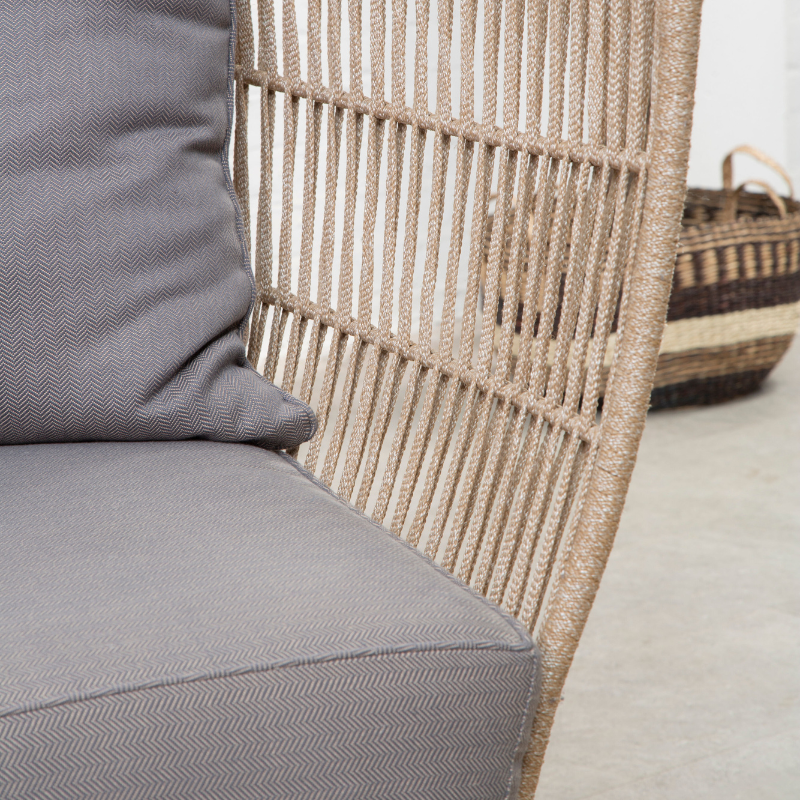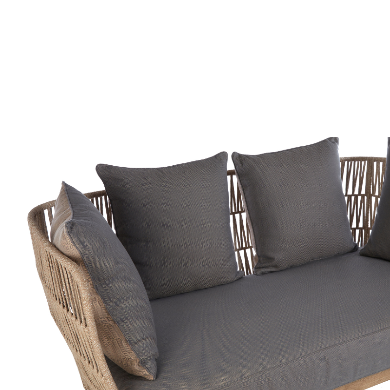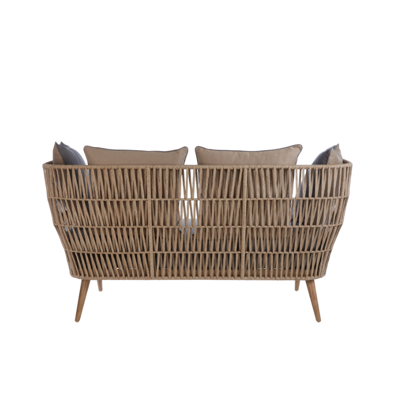 Designed for both comfort and visual appeal, the Mareeka 2 Seat Rope Sofa is a modern accent piece ideal for relaxed indoor or outdoor lounging. The handwoven rope detailing wraps around the frame in an open weave pattern, giving it a breezy, artisanal character. A generously padded seat and four soft, reversible scatter cushions provide plush comfort, while the eucalyptus wood legs introduce a touch of organic texture and sustainability.