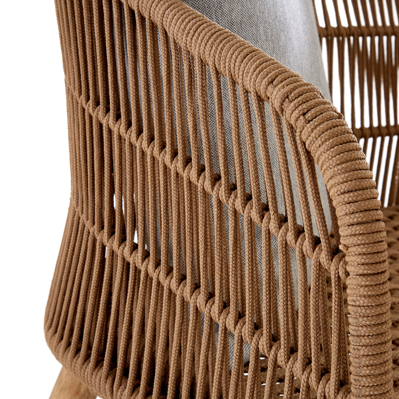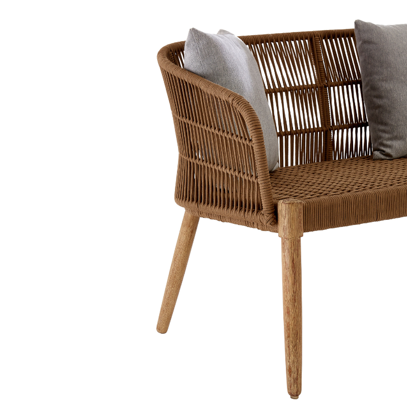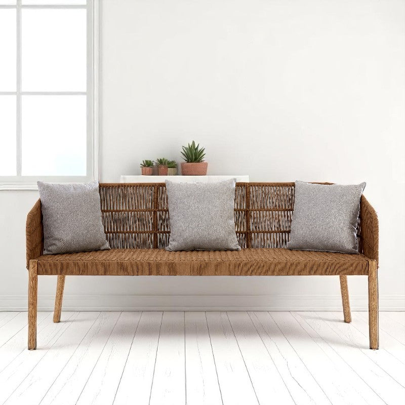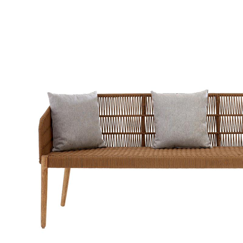 A contemporary take on classic outdoor seating, the Maryanne 3 Seater Sofa blends natural texture with laid-back elegance. Handwoven rope forms a refined and breathable backrest and seat, offering visual interest and support. Its low profile and gently flared arms create an inviting silhouette, while the slender wooden legs add a light, organic finish. Complete with three plush grey cushions, this sofa is perfect for open-air lounging or enhancing a breezy interior space.