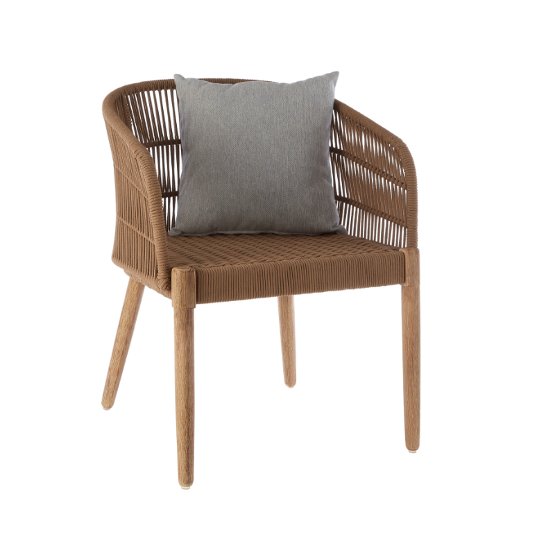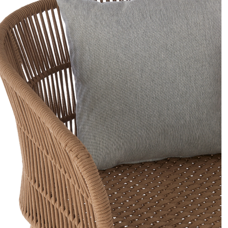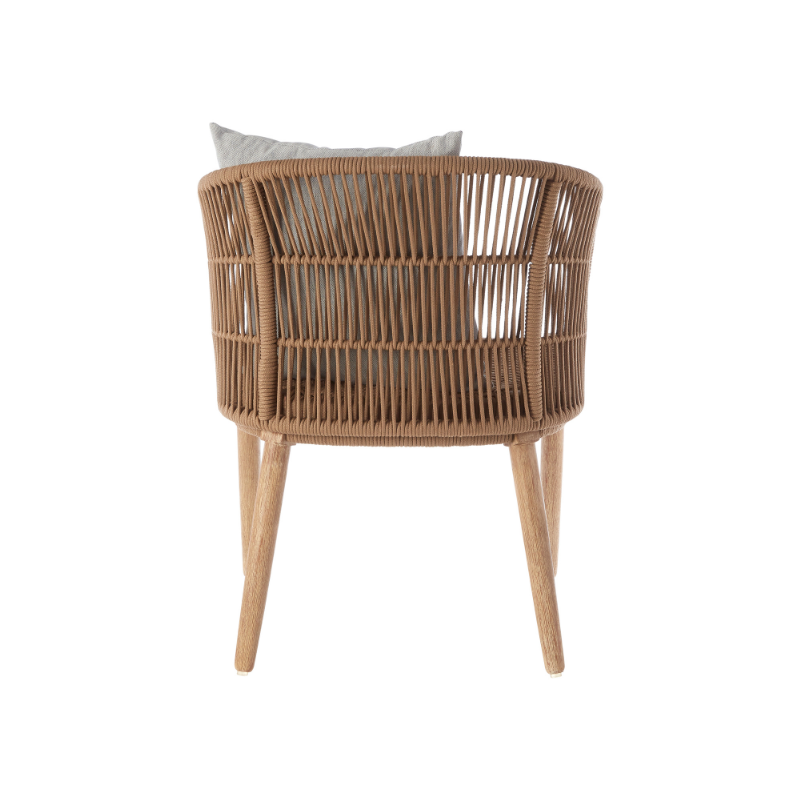 Blending contemporary form with artisanal flair, the Maryanne Armchair brings texture and character to indoor or outdoor living spaces. Crafted with a tightly wrapped rope seat and backrest, the chair’s clean-lined silhouette is balanced by gently tapered wooden legs. The open-weave detail along the sides and back offers a breezy feel, while the included cushion adds an extra layer of comfort and contrast. Whether styled on a terrace or within a relaxed reading nook, this piece is both inviting and effortlessly stylish.