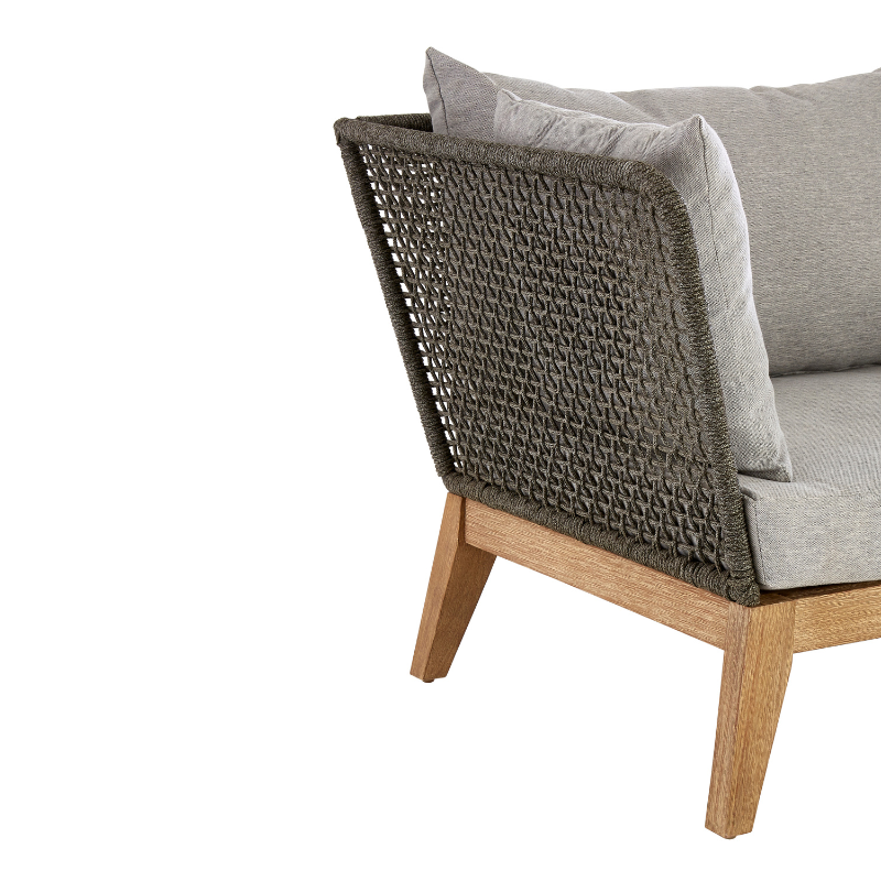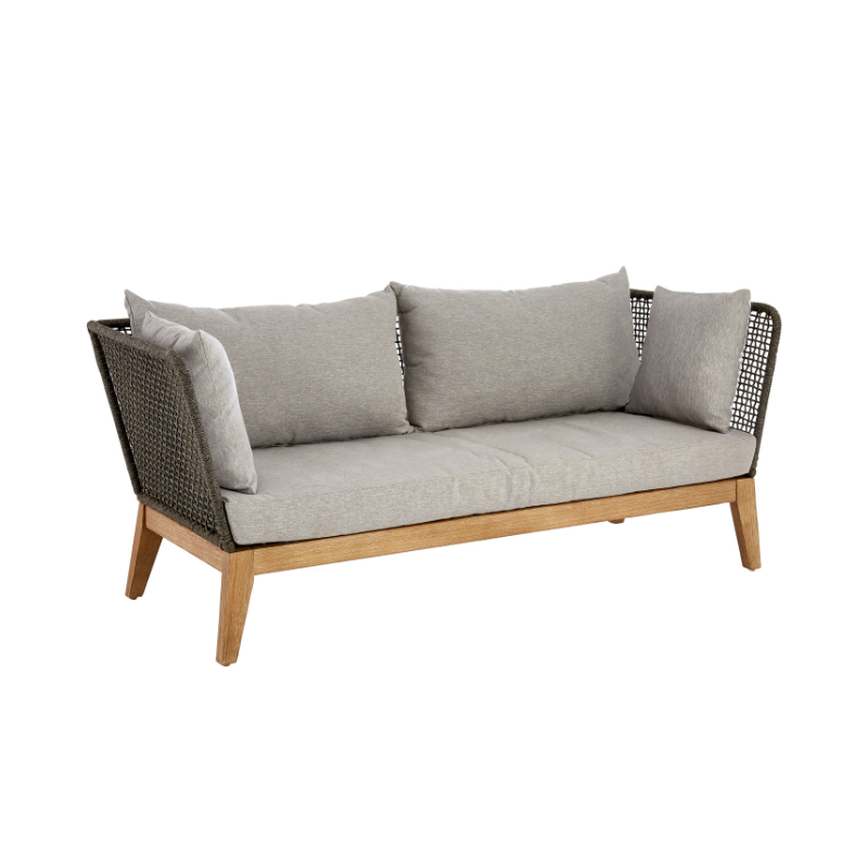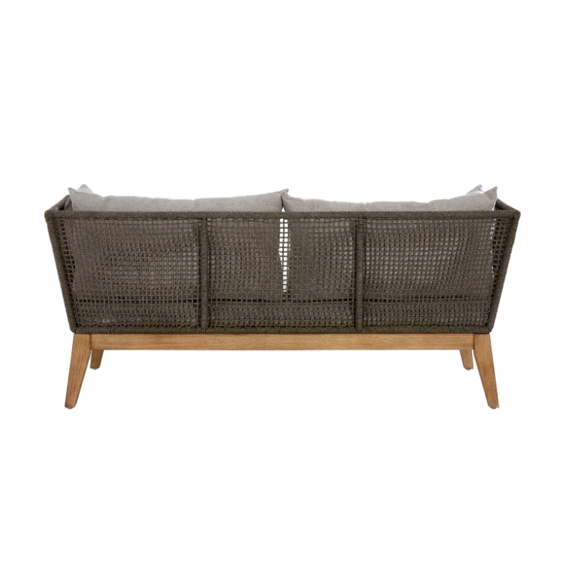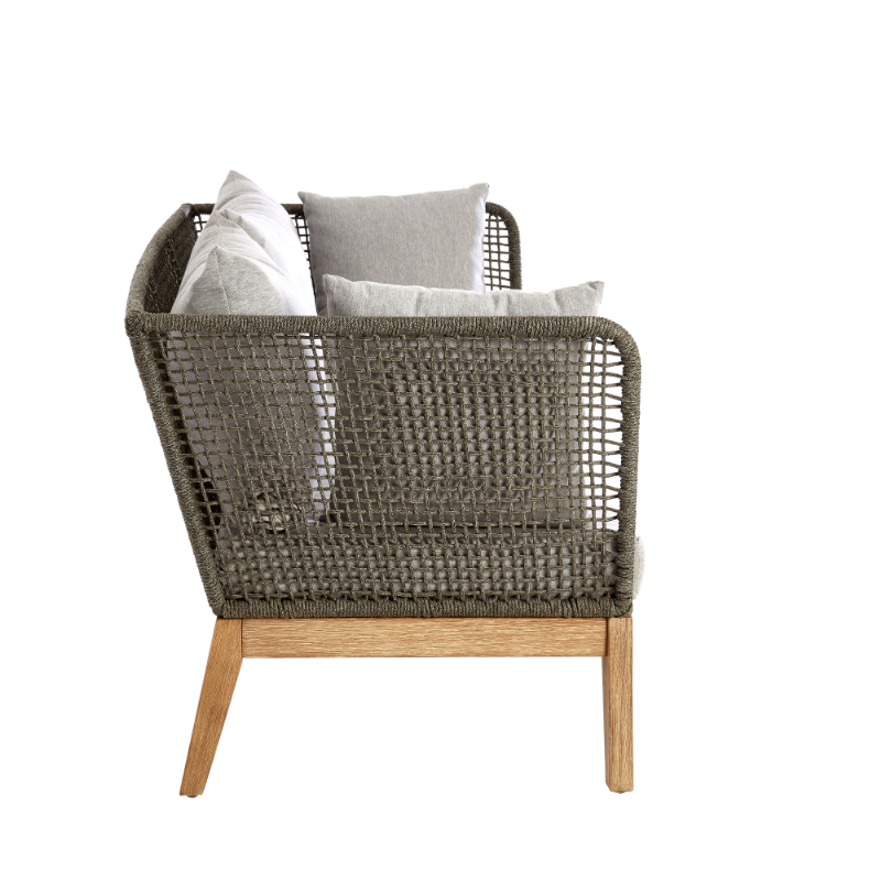 Add understated elegance and timeless comfort to your living space with the Merced 3-Seater Grey Sofa. Expertly woven from grey rope, this spacious sofa showcases flared arms and a gently reclined back, creating a sculptural silhouette that’s as inviting as it is stylish. The open-weave sides and back introduce texture and airflow, while the plush seat and back cushions promise comfort in every sit. A natural wood base with angled legs brings a touch of mid-century modern charm, making this piece a versatile fit for both contemporary and classic interiors.