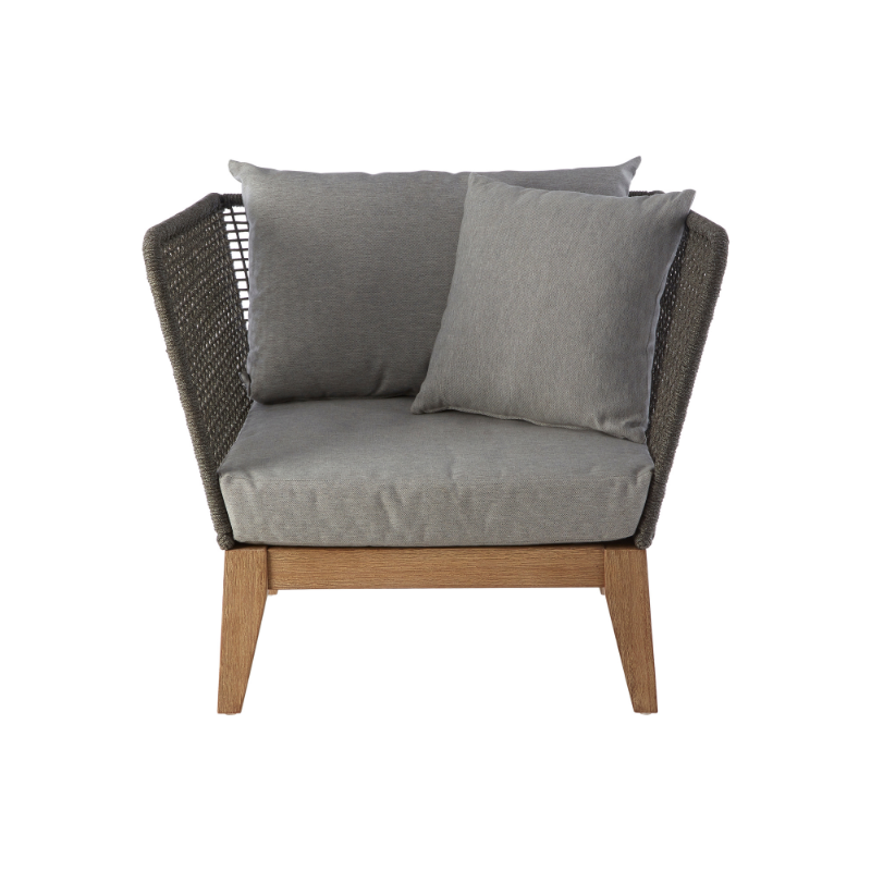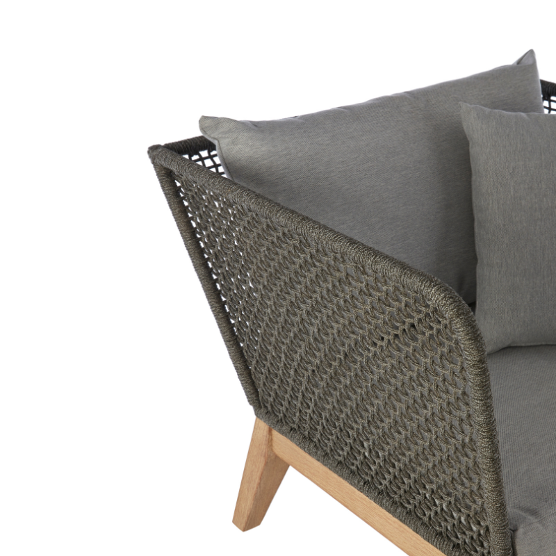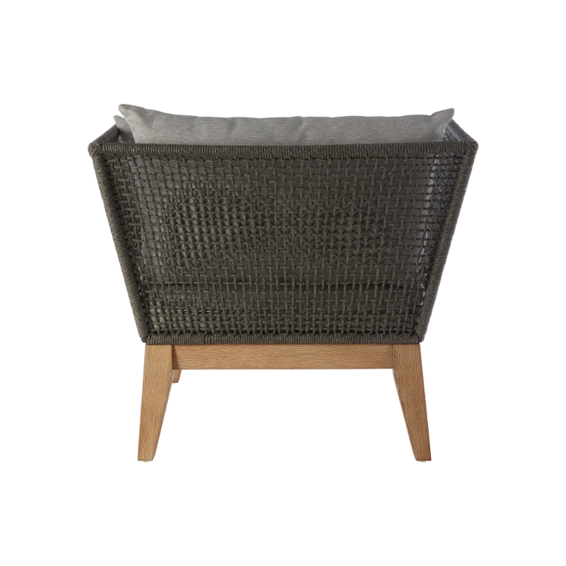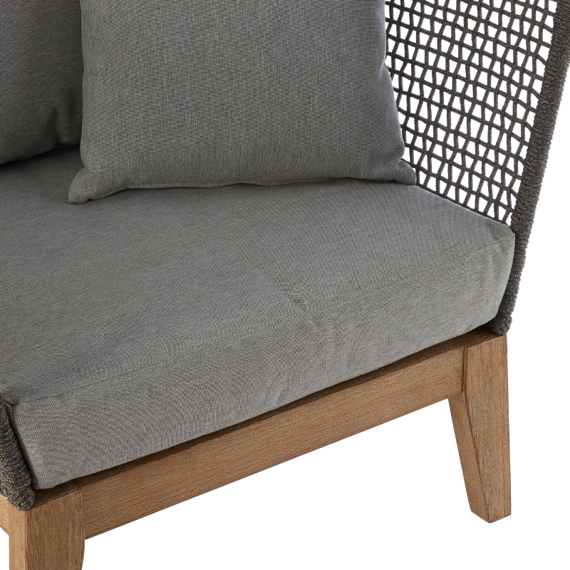 The Merced Grey Armchair blends sculptural form with laid-back elegance, offering a refined yet relaxed seating option for contemporary and transitional interiors. Intricately handwoven from grey rope, this accent chair features a softly flared back and arms that embrace you in comfort. Decorative textured ropework continues across the raised sides and cushioned seat, while the angular natural wood legs add a warm, mid-century modern edge.
