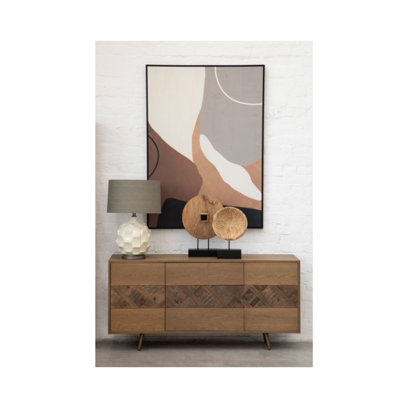 The Taling Table Lamp with Grey and Brown Shade features a ceramic segmented base and brown stand. The warm, neutral tones of this piece create a contemporary but cosy aesthetic.